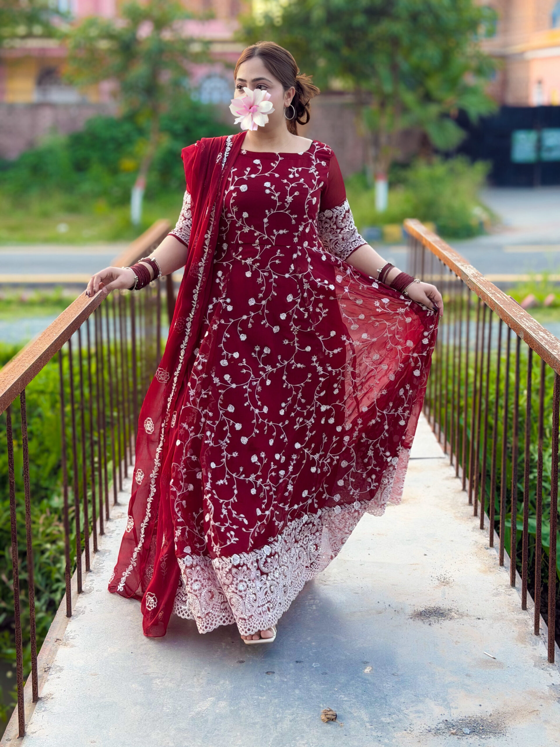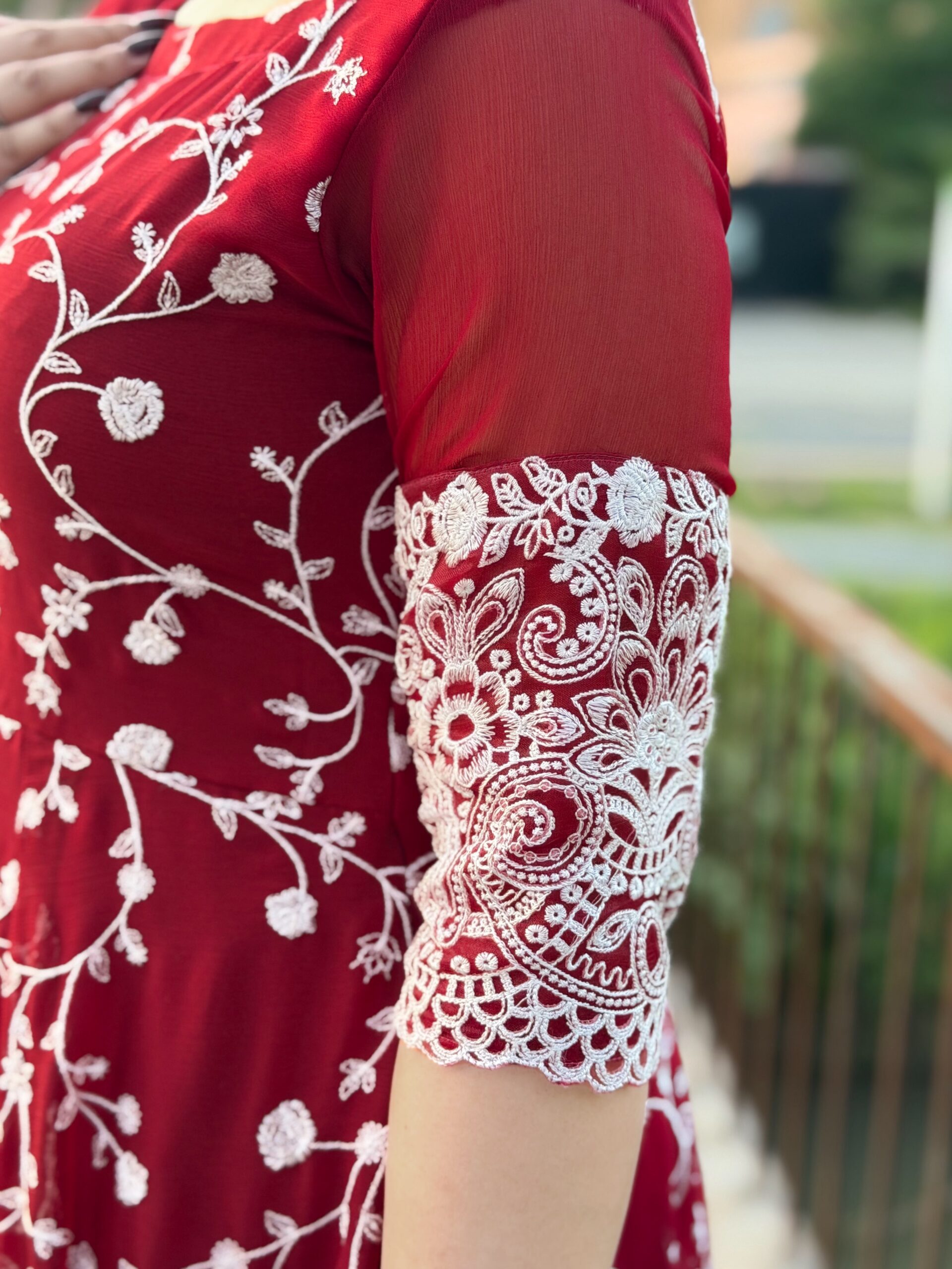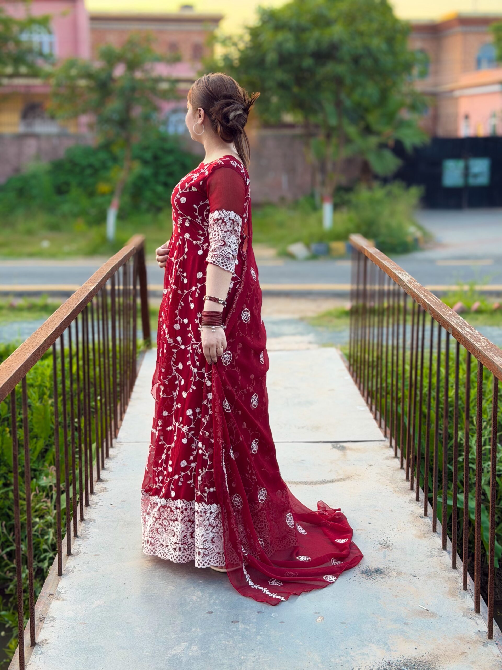 Crafted in a rich maroon chiffon, adorned with intricate white embroidery that speaks the language of grace…Every detail is designed to celebrate femininity, confidence, and effortless charm.
