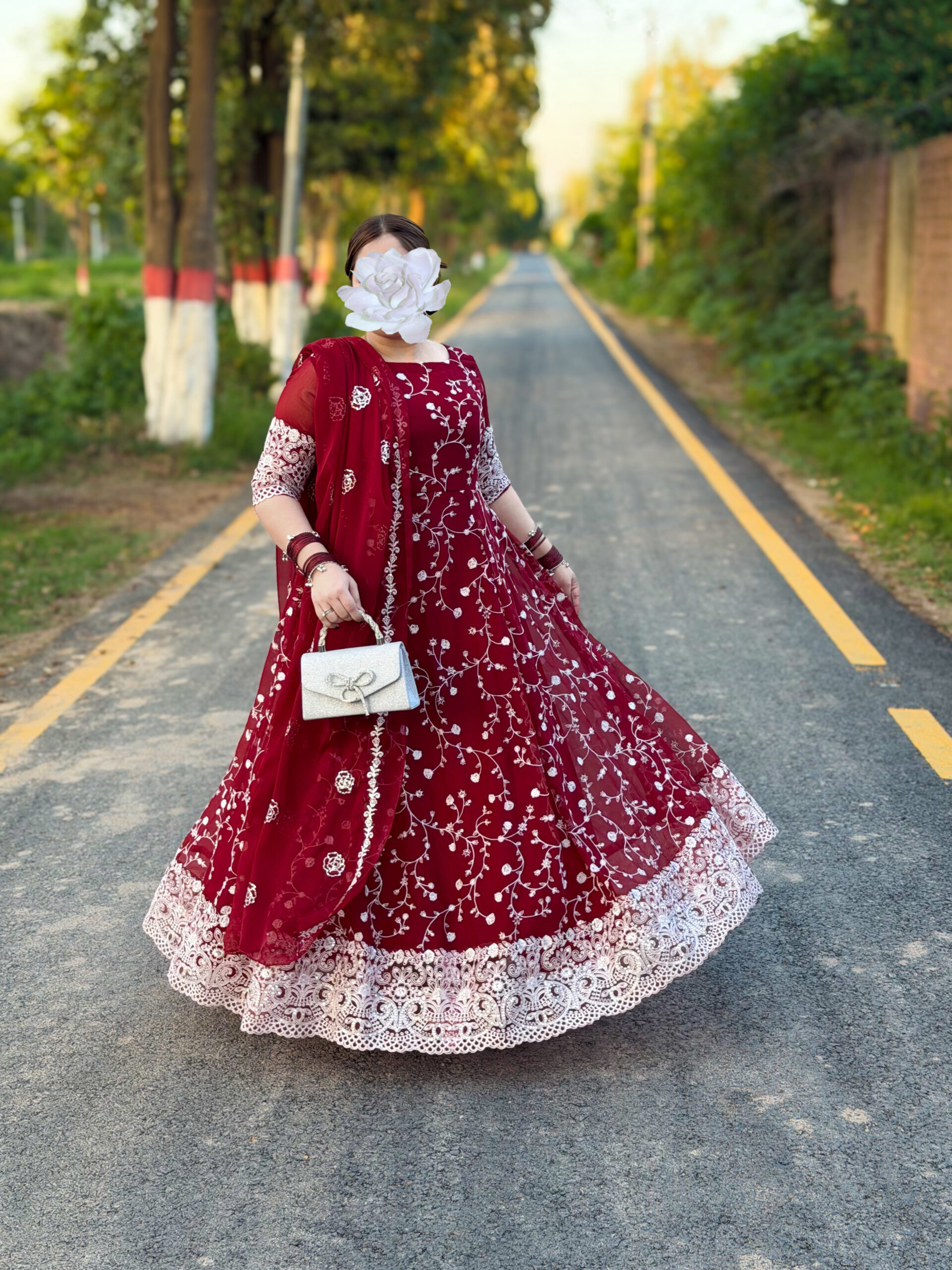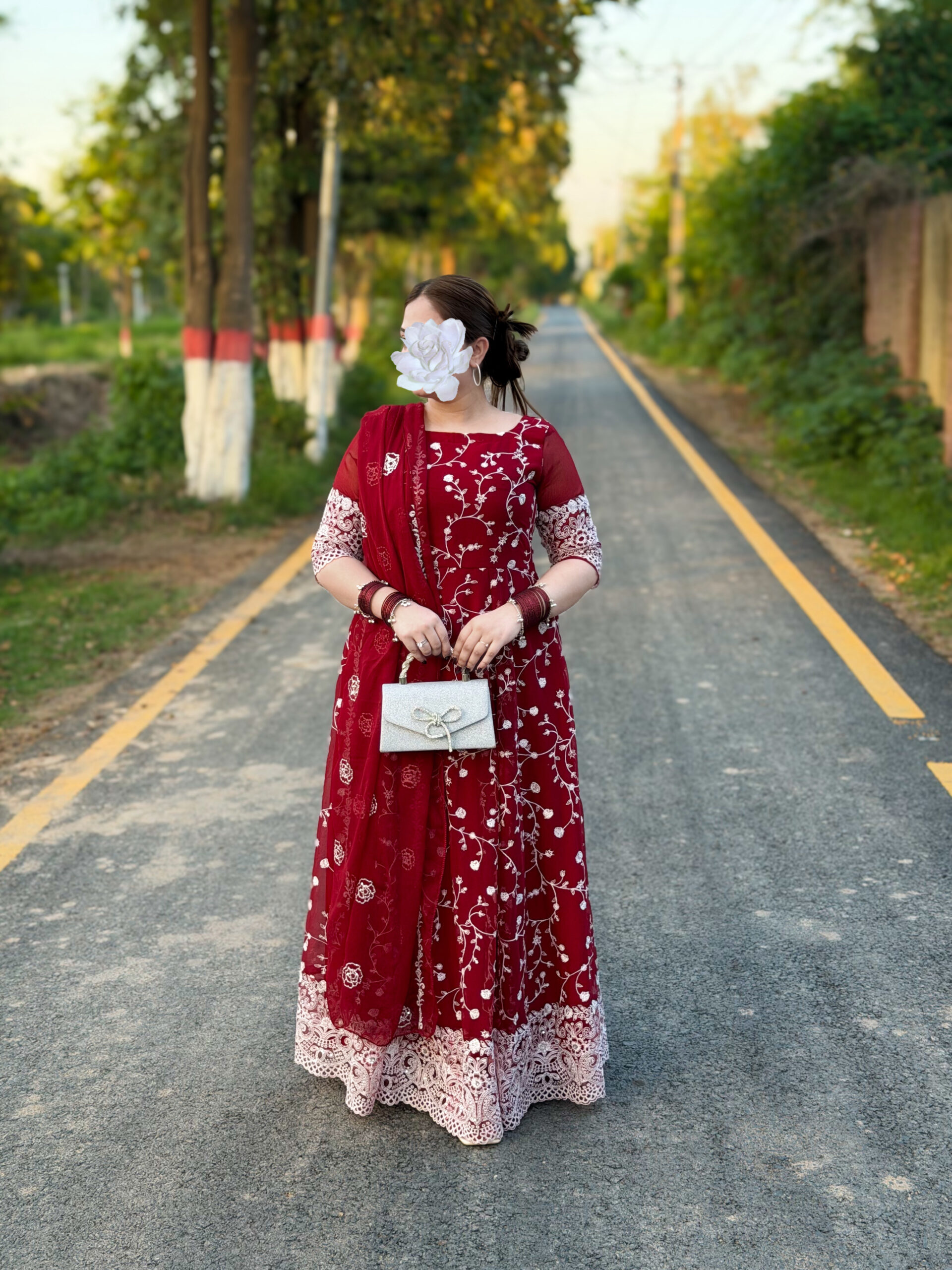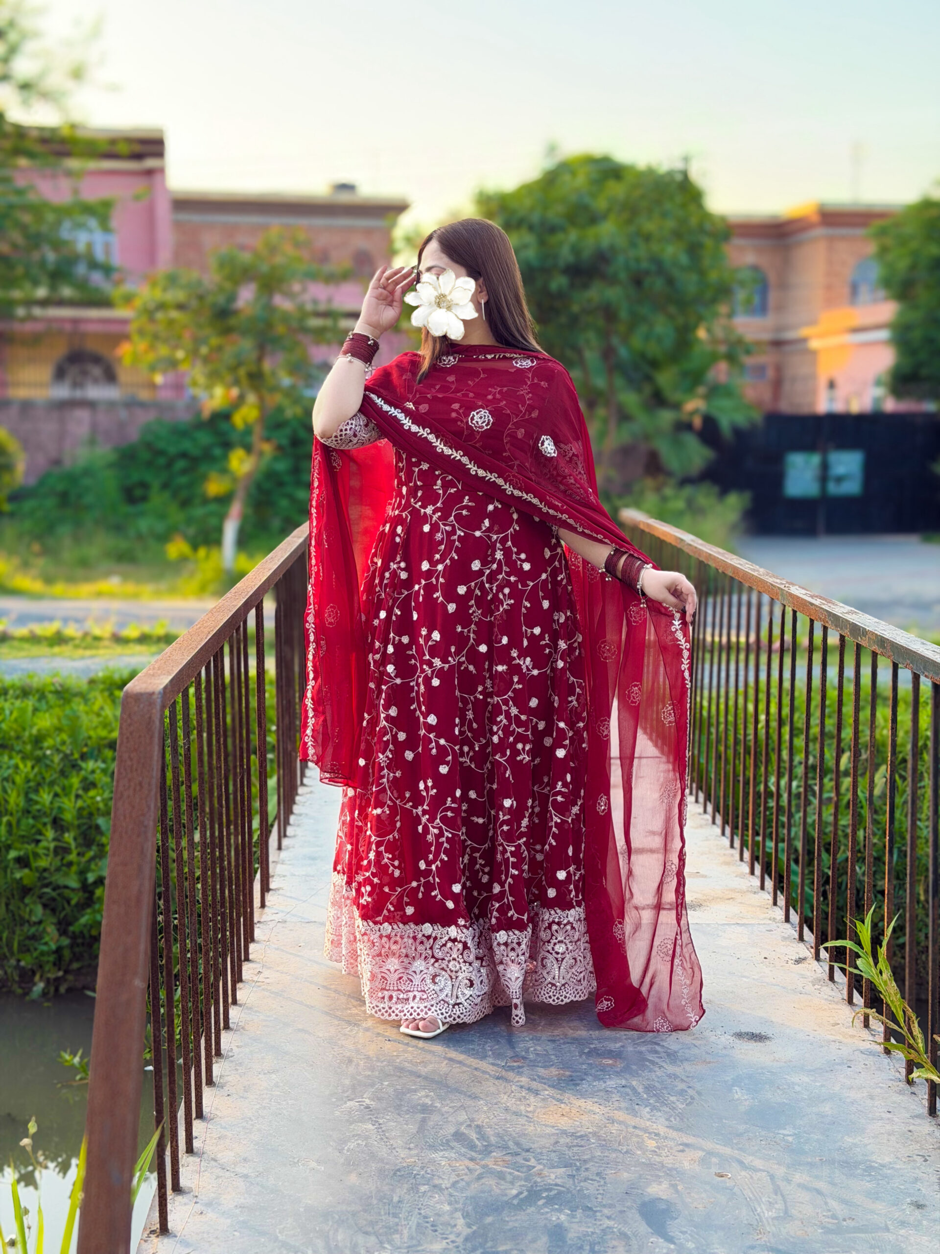 Crafted in a rich maroon chiffon, adorned with intricate white embroidery that speaks the language of grace…Every detail is designed to celebrate femininity, confidence, and effortless charm.