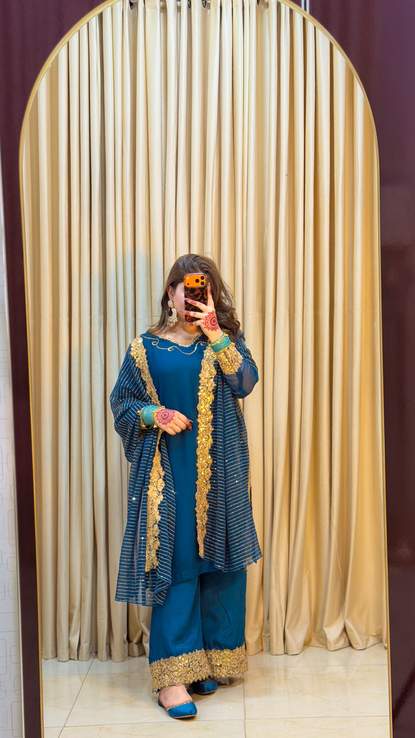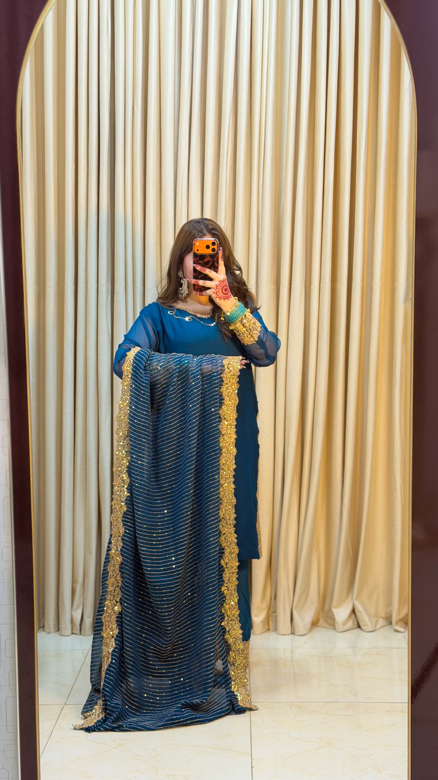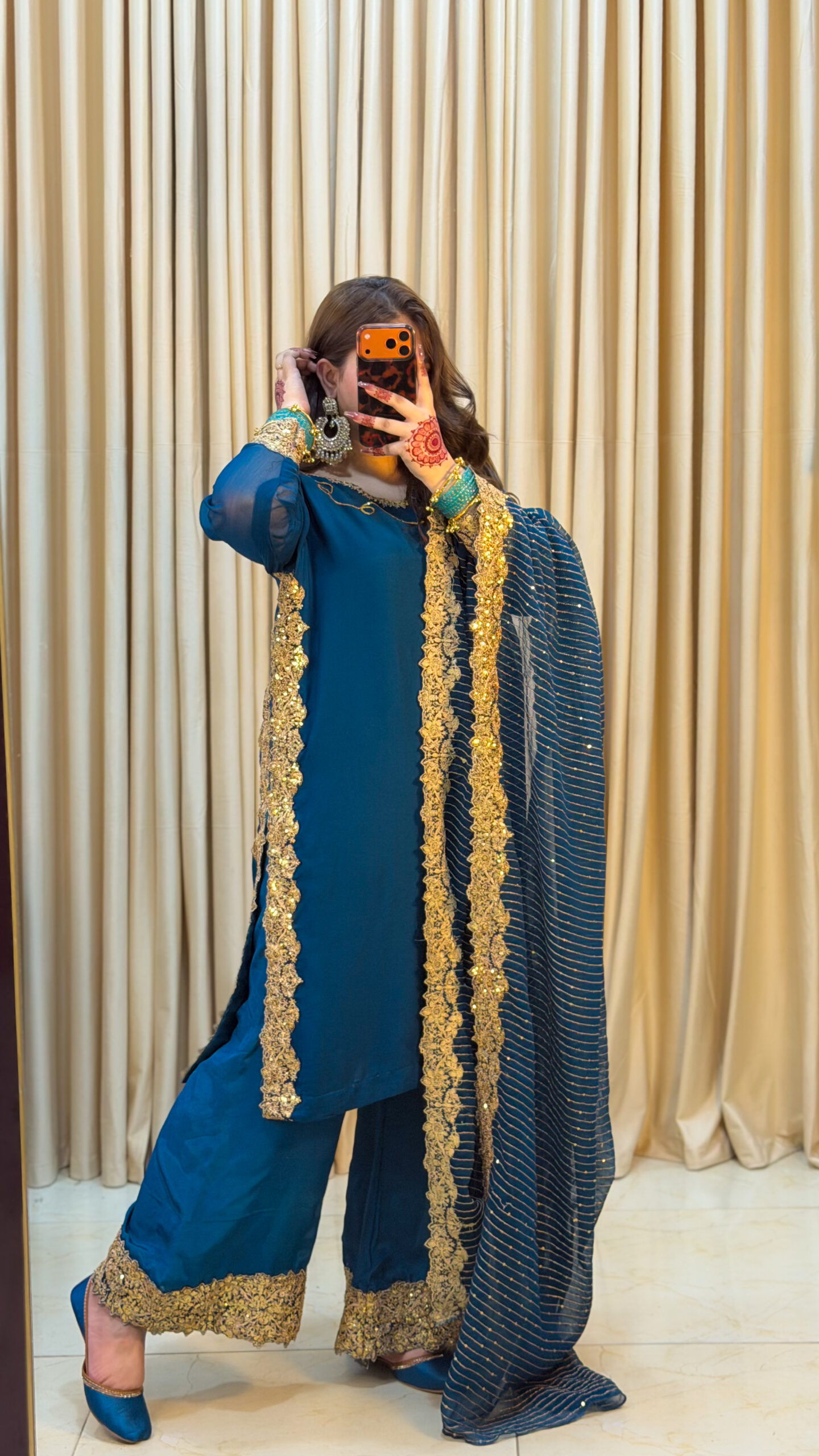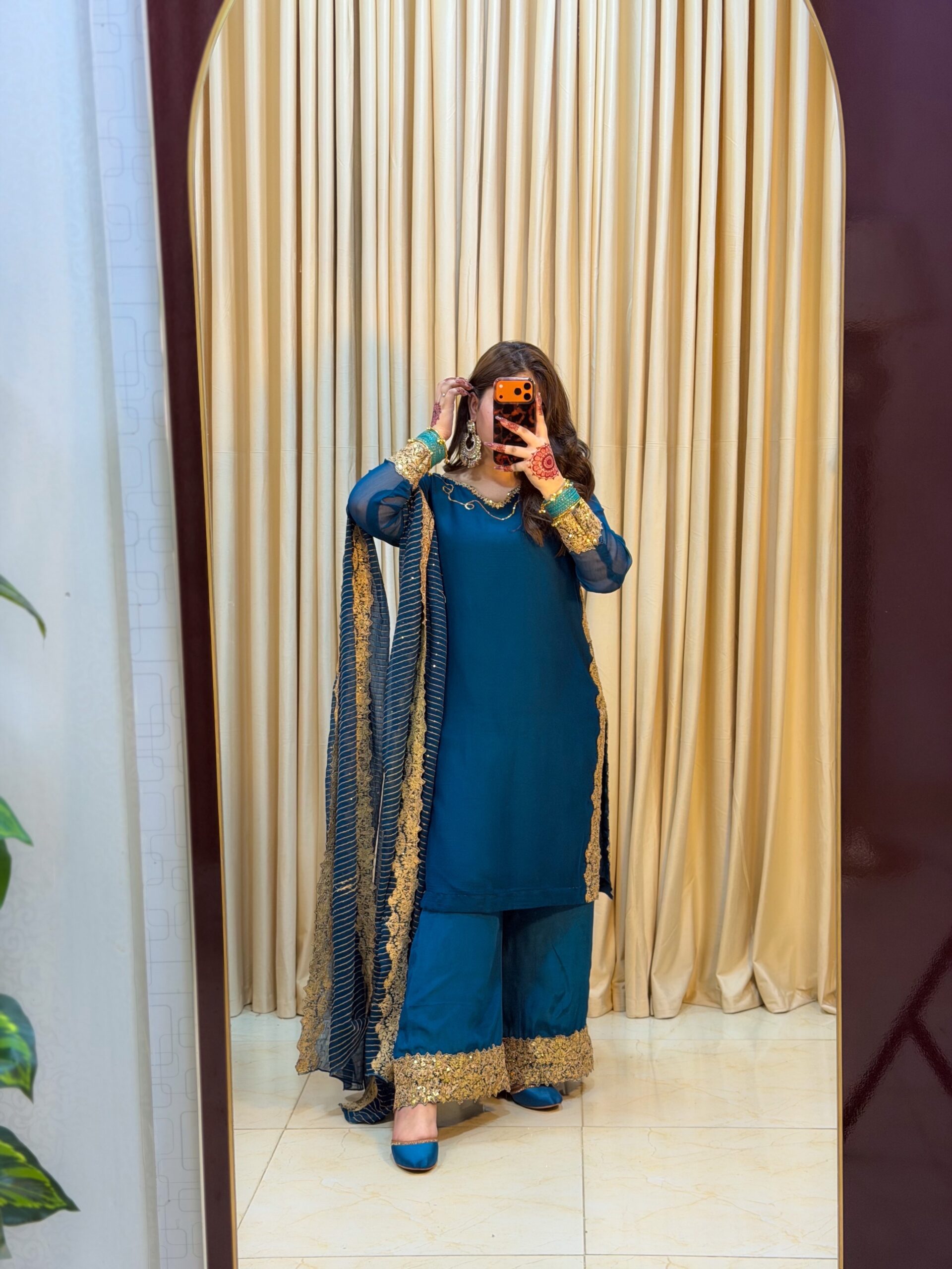 A stunning deep zinc outfit beautifully enhanced with intricate golden embroidery and lace detailing, giving the perfect blend of grace and luxury. The straight shirt paired with matching trousers and a delicately embellished dupatta creates a timeless festive look.